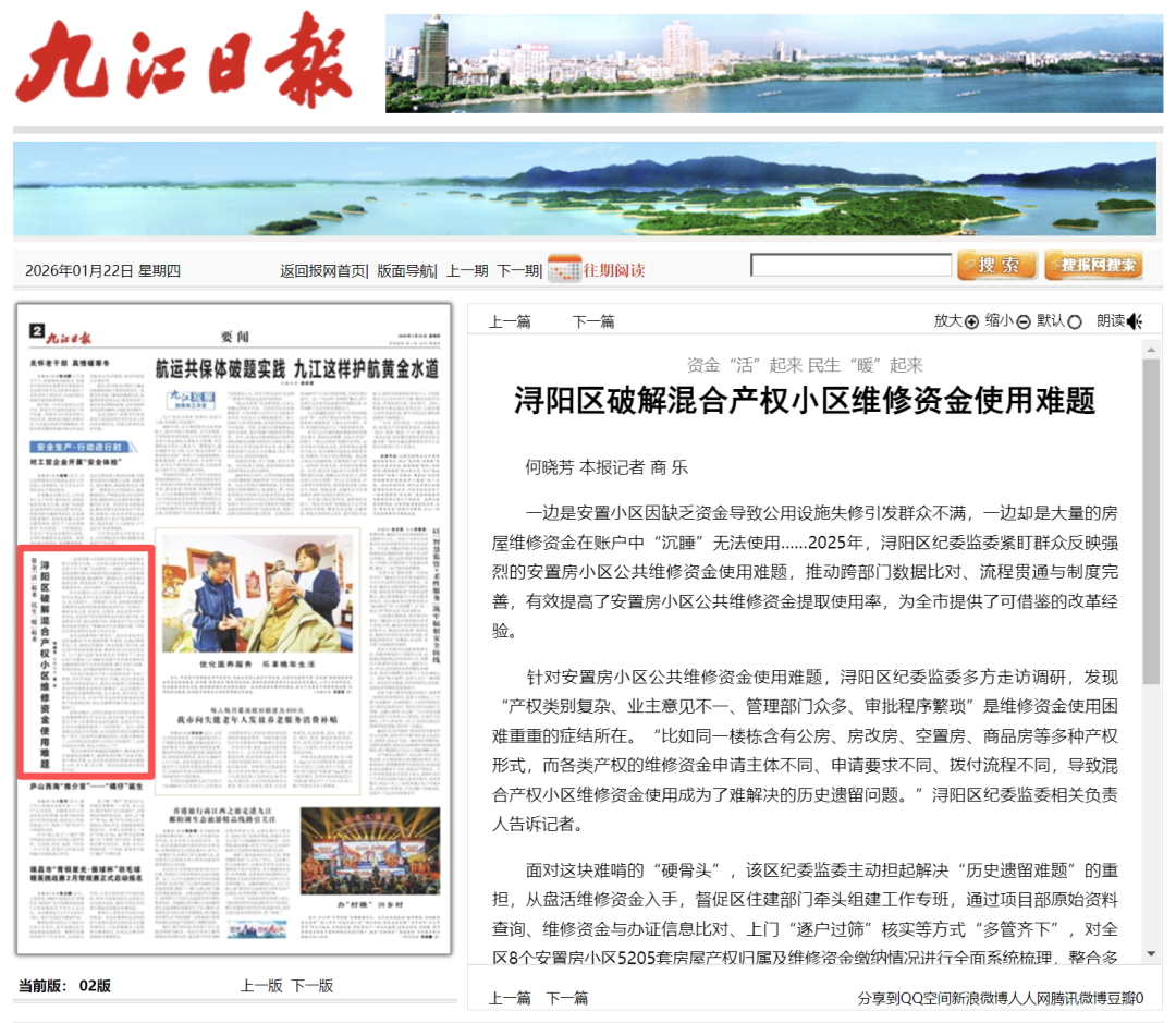 一边是安置小区因缺乏资金导致公用设施失修引发群众不满,一边却是大量的房屋维修资金在账户中“沉睡”无法使用……2025年,浔阳区纪委监委紧盯群众反映强烈的安置房小区公共维修资金使用难题,推动跨部门数据比对、流程贯通与制度完善,有效提高了安置房小区公共维修资金提取使用率,为全市提供了可借鉴的改革经验。